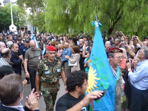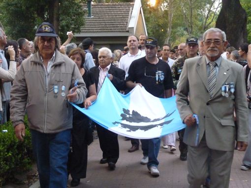 “Algunos fuimos como militares de carrera y estábamos preparados; otros fueron como conscriptos y civiles movilizados por distintas razones”, resumió. “En la acción real no hay color de uniforme, solamente la celeste y blanca que nos unía a todos”, pronunció. “Las guerras las deciden los ministros, los embajadores y los plurigalonados de las Fuerzas Armadas. Pero las terminan combatiendo los soldados en sus trincheras, los marinos en su pequeño universo y los aviadores solos entre el cielo y la tierra. Y son todos ellos, entre los que me incluyo, quienes hoy están presentes; a ellos me dirijo tomando el atrevimiento como argentino de agradecerles lo hecho y felicitarlos por los logros”, manifestó el almirante Molina Pico. “Los veteranos tenemos el desafío de recuperar la historia diciendo con orgullo ‘¡Soy veterano!’”, concluyó. Para concluir la ceremonia se entonó la Marcha de Malvinas y los veteranos desfilaron por la vereda que rodea a la plaza Irlanda.